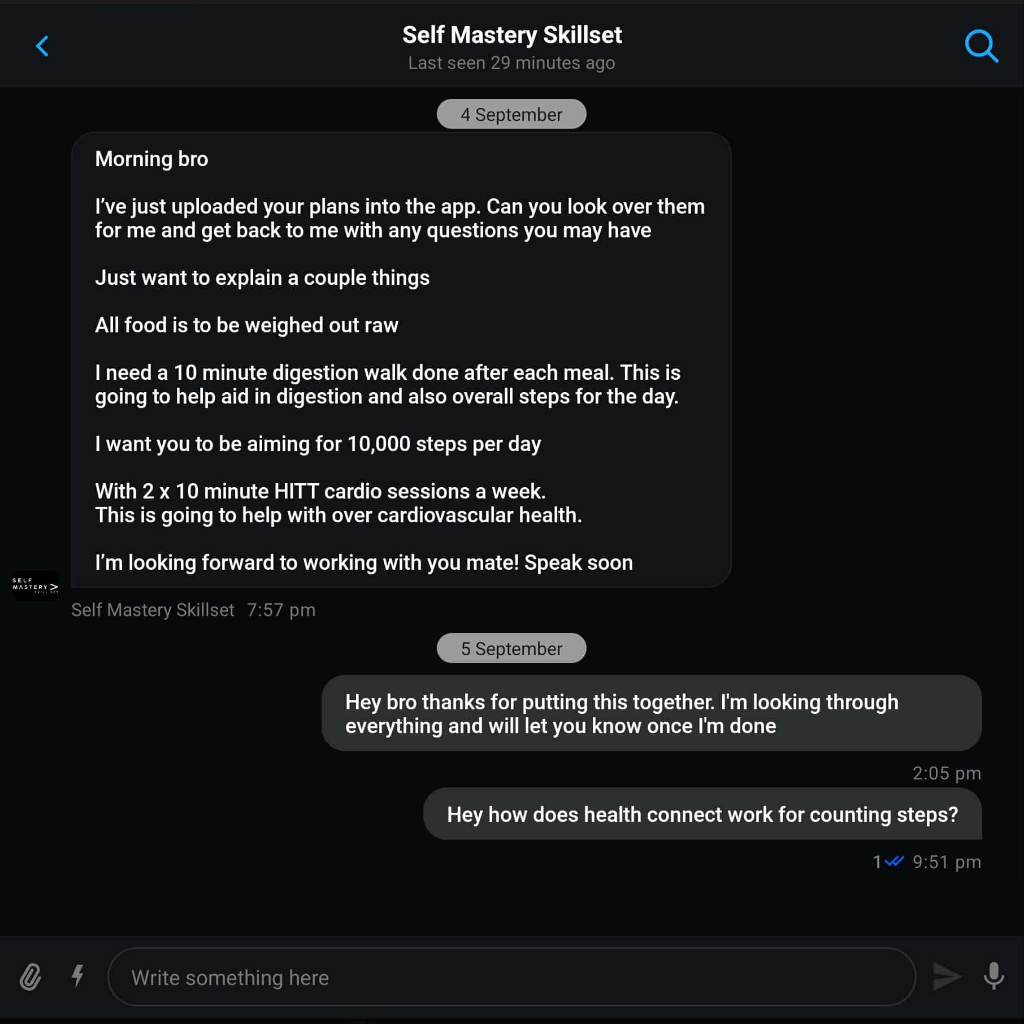 On demand access to workouts, meals, daily logs for sleep, water, macros and to private message me.